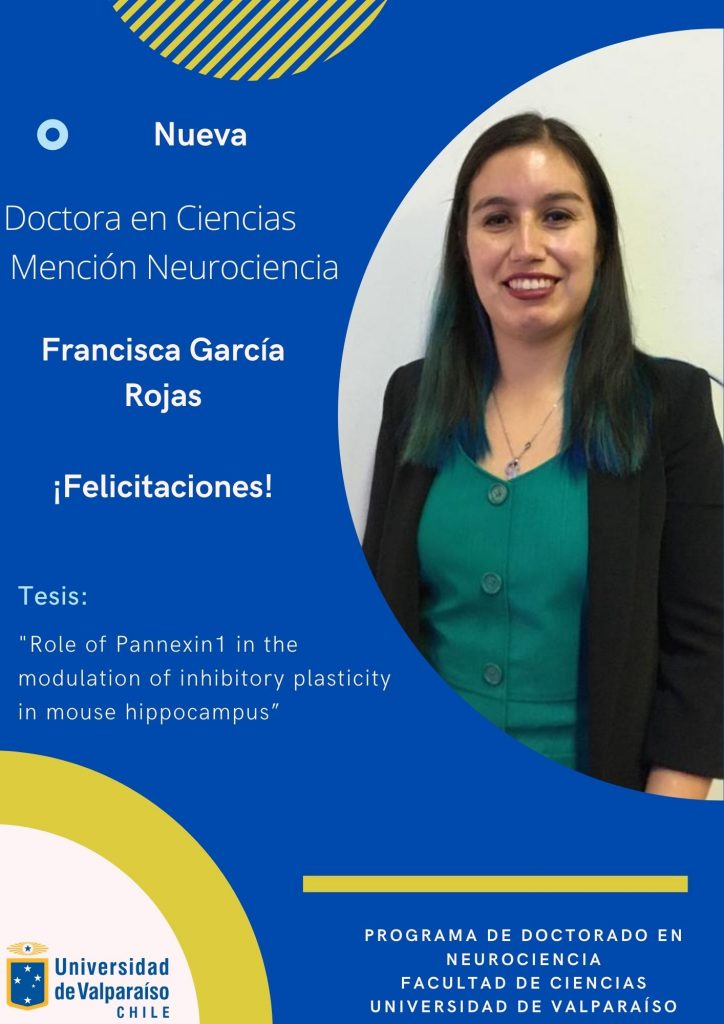 El Programa de Doctorado en Ciencias Mención Neurociencias de la Universidad de Valparaíso informa que la estudiante Francisca García Rojas, tras un desempeño notable en su defensa de tesis, donde obtuvo distinción máxima, obtuvo su grado de Doctora en Neurociencias. Un logro que sin duda, marcará su vida académica y personal. Felicitamos también a sus directores de tesis, los doctores Marco Fuenzalida y Álvaro Ardiles, quienes la acompañaron en alcanzar este desafío.